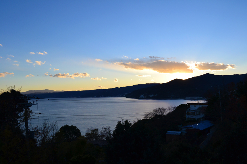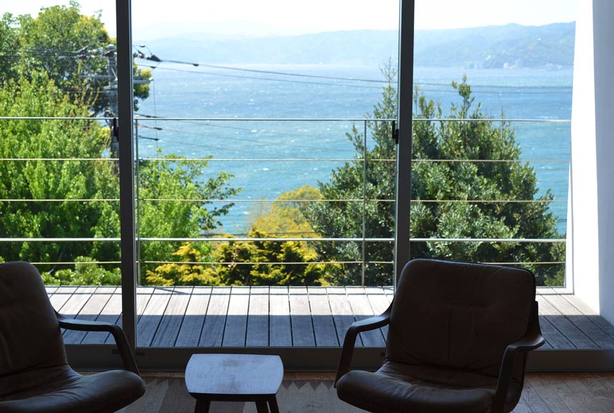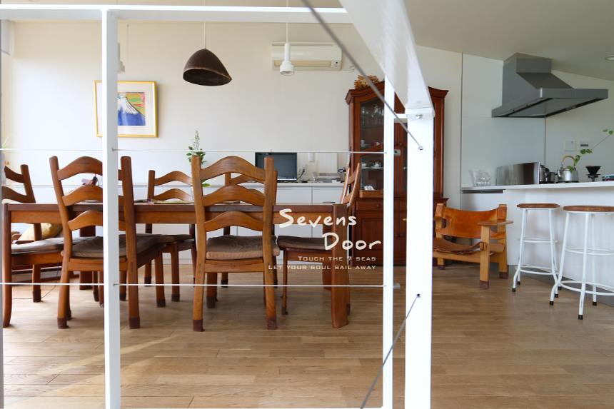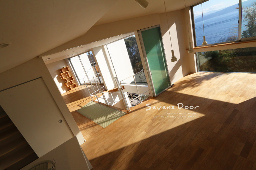 多くの人を魅了する真鶴半島南西側から眺める一大パノラマとなって広がる景色。湯河原から始まる入江は遠く城ヶ崎海岸まで連なる。海に落ち込む岬が山へと変化し天城連山を造る姿に自然の壮大さを覚える。「Sevens Door」はその絶景を部屋のどこにいても視界の傍らに感じられる。ドラマチックに変化する自然の織り成すプログラムがいつも感じられるスペシャルなユニットといえる。